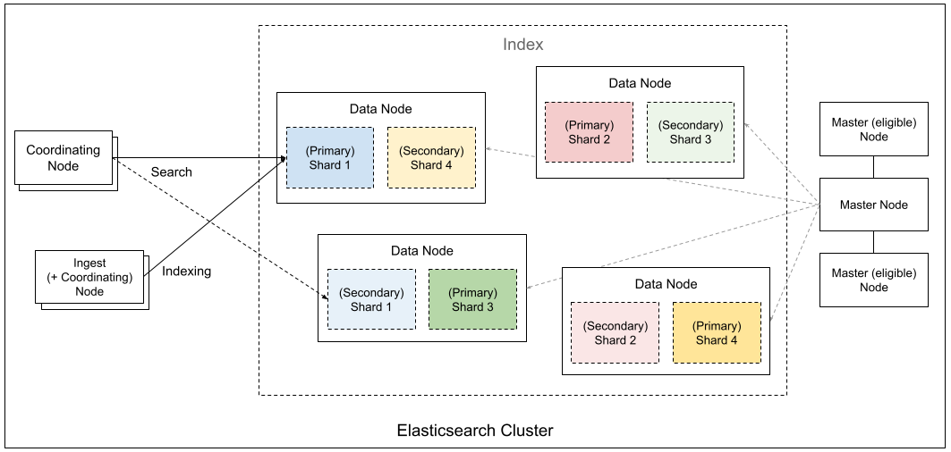 معمولا توی الستیک همهی نودها master-eligible هستن به صورت دیفالت. در هر لحظه فقط یک نود مستر باید توی کلاستر باشه که طی یک فرآیند اجماع و رای گیری که بین نودهای master-eligible انجام میشه، انتخاب میشه. نود مستر وظایفی مثل ساخت و حذف ایندکسها، ترک کردن نودها و اختصاص دادن شاردها به اونها رو بر عهده داره. در ادامه مسیرمون با مفهوم ایندکس و شارد آشنا میشیم.