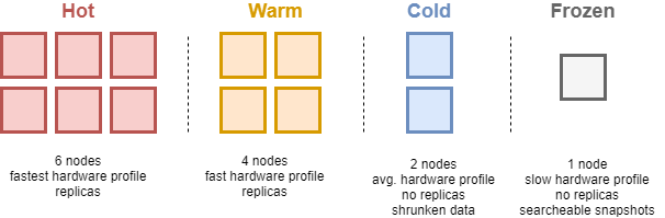 نمیتونیم همه دیتای لاگ و … رو برای همیشه و با اهمیت یکسان بخواهیم نگه داریم کارمون خیلی سخت میشه. اینجا سر و کله مفهوم Tiering پیدا میشه، میاییم یه سری مرحله برای دیتامون تعریف میکنیم که به مرور با گذشت زمان دیتاهایی که دیگه ازشون زیاد استفاده نمیکنیم یا کمتر مورد استفاده هستند رو به سمت این ببریم که حذفشون کنیم یا روی نودهایی ذخیره کنیم که ارزونتر هستند، مشابه این مفهوم رو توی آبجکت استورجها هم داریم. حالا هات دیتا نودها در واقع نودهایی هستن که دیتای ما رو که اخیرا ایجاد شده و بیشترین سرچ رو اون هست رو نگهداری میکنه. این نودها نیاز دارند که سرعت خواندن و نوشتن بالایی داشته باشند به همین علت استفاده از دیسک های SSD توی اونها متداول هست. معمولا نودهای هات ما نودهای گرونتری هستند که ظرفیت کمی دارند اما سرعت خیلی بالایی به ما میدهند.